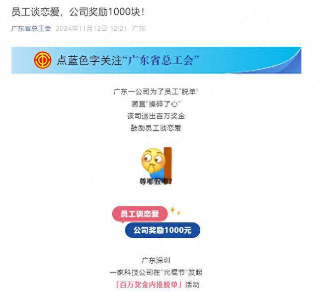 8、 深圳一公司百万奖金鼓励员工恋爱★,脱单后奖励千元,活动已促成近百对员工相亲。